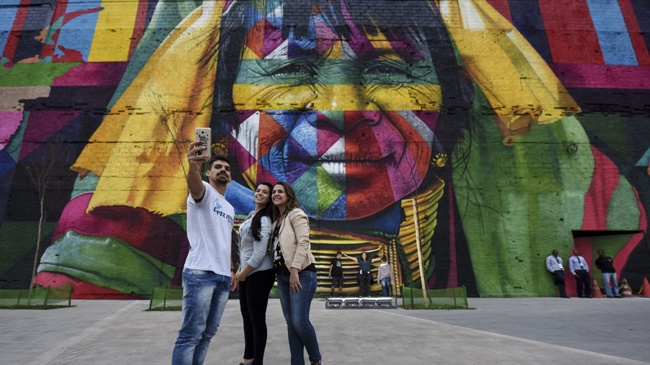 這幅噴繪壁畫總面積達(dá)3000平方米,由巴西噴繪壁畫藝術(shù)家科布拉在里約奧運(yùn)會(huì)開幕前夕創(chuàng)作完成。壁畫描繪了全球五大洲的土著居民頭像,并利用藍(lán)、黃、黑、綠、紅奧運(yùn)五環(huán)色彩為主色塊拼繪而成,用意借助奧運(yùn)精神宣傳全球不同種族、民族間的寬容與和諧。