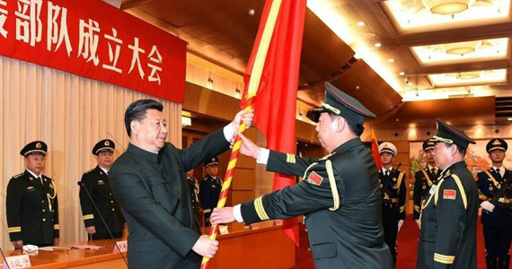 中國(guó)人民解放軍陸軍領(lǐng)導(dǎo)機(jī)構(gòu)、中國(guó)人民解放軍火箭軍、中國(guó)人民解放軍戰(zhàn)略支援部隊(duì)成立大會(huì)12月31日在八一大樓隆重舉行。中共中央總書記、國(guó)家主席、中央軍委主席習(xí)近平向陸軍、火箭軍、戰(zhàn)略支援部隊(duì)授予軍旗并致訓(xùn)詞,代表黨中央和中央軍委向同志們、向全軍部隊(duì)致以熱烈祝賀。