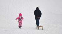 1月12日,在瑞士達沃斯,一對父女在雪坡上行走。