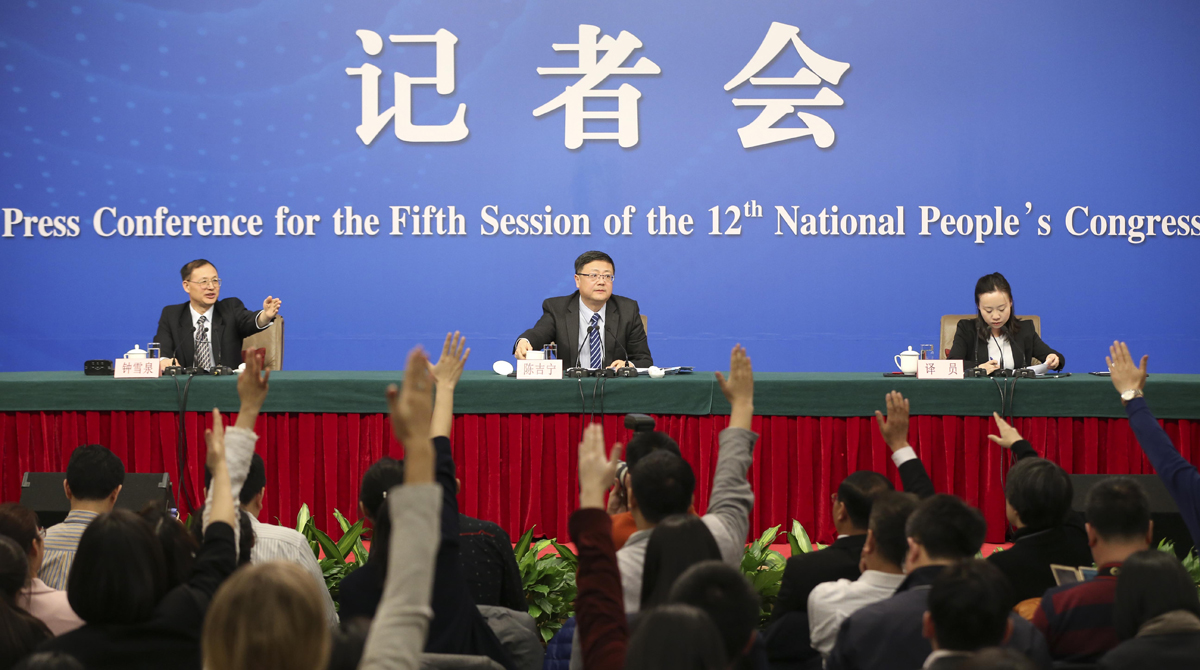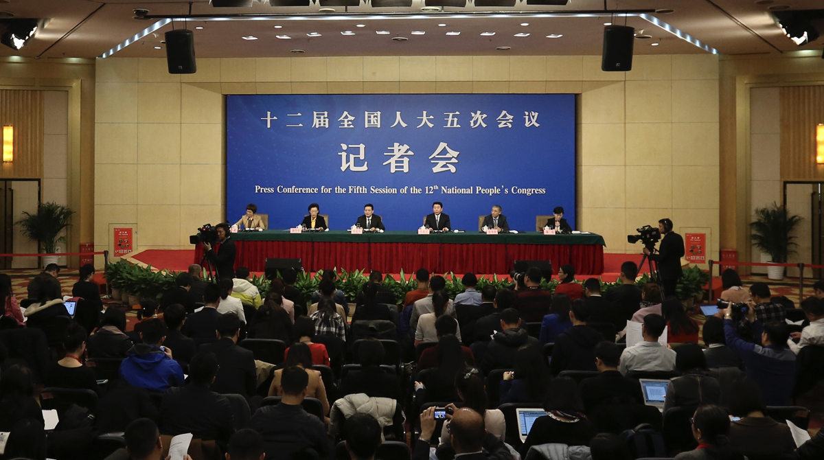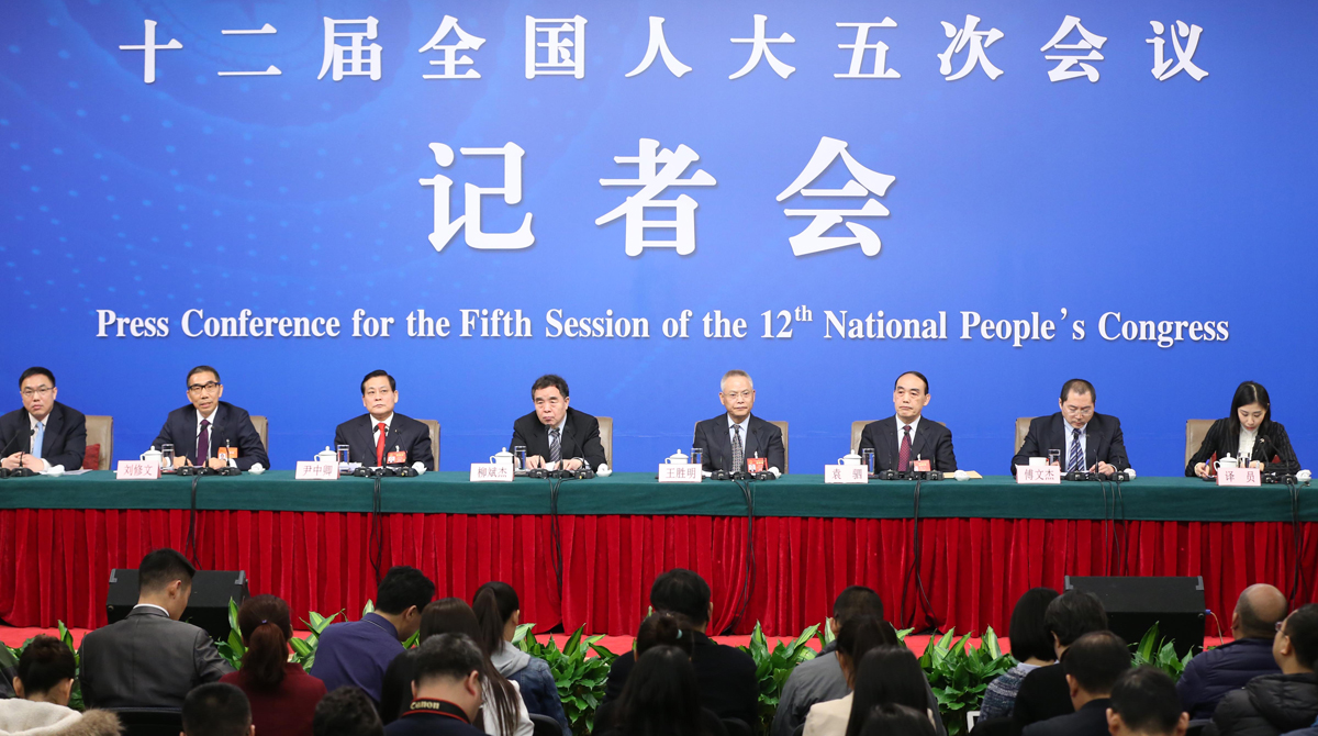 2017年3月10日,十二屆全國人大五次會(huì)議新聞中心舉行記者會(huì),全國人大教科文衛(wèi)委員會(huì)主任委員柳斌杰、內(nèi)務(wù)司法委員會(huì)副主任委員王勝明、財(cái)政經(jīng)濟(jì)委員會(huì)副主任委員尹中卿、環(huán)境與資源保護(hù)委員會(huì)副主任委員袁駟、全國人大常委會(huì)預(yù)算工作委員會(huì)副主任劉修文、全國人大常委會(huì)辦公廳秘書局巡視員傅文杰就“人大監(jiān)督工作”的相關(guān)問題回答中外記者的提問。