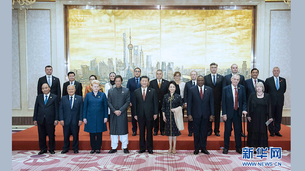 11月5日,國家主席習近平在上海同出席首屆中國國際進口博覽會的外國領導人共同巡館。