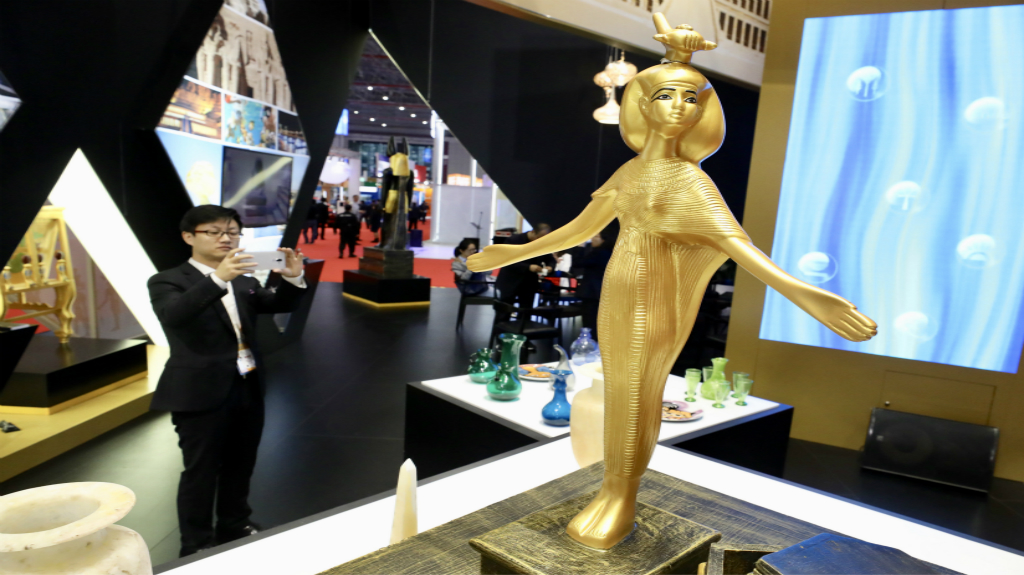 國家展中,印度尼西亞、越南、巴基斯坦、南非、埃及、俄羅斯、英國、匈牙利、德國、加拿大、巴西、墨西哥等12個主賓國均設立了獨具特色的展館。 新華社記者 韓瑜慶 攝 11月5日,一名參觀者在德國展館內拍攝雙護盾盾構機模型。