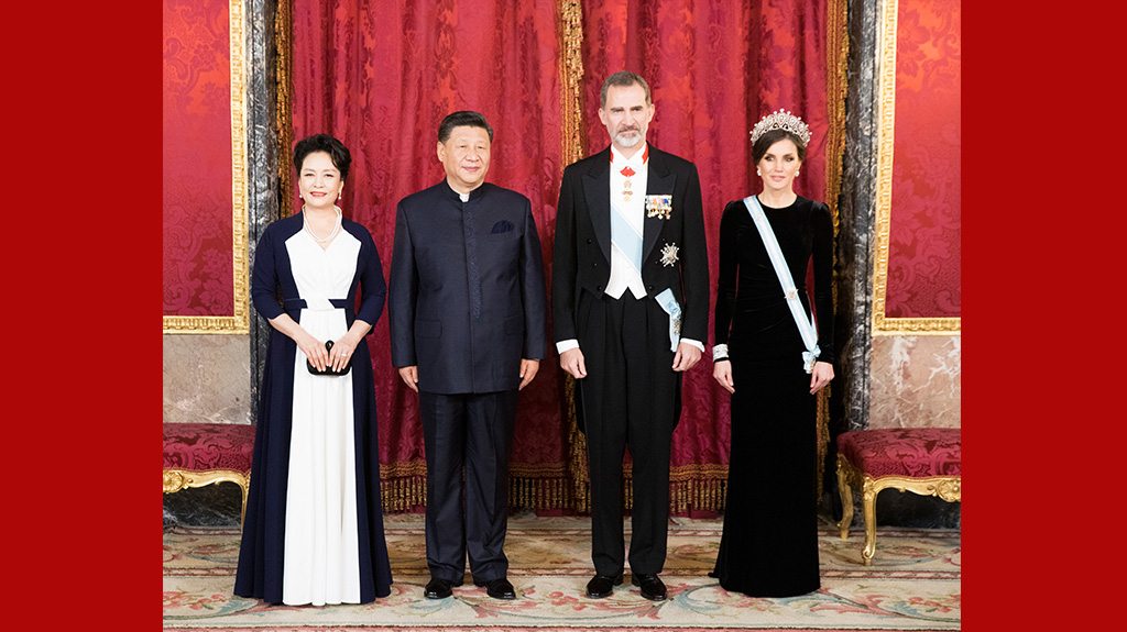 當地時間11月28日,國家主席習近平在馬德里出席西班牙國王費利佩六世舉行的隆重、盛大的歡迎儀式。習近平和夫人彭麗媛乘皇家禮車在身著禮服、騎著高頭大馬的西班牙皇家衛隊騎兵護衛下,前往武器廣場。