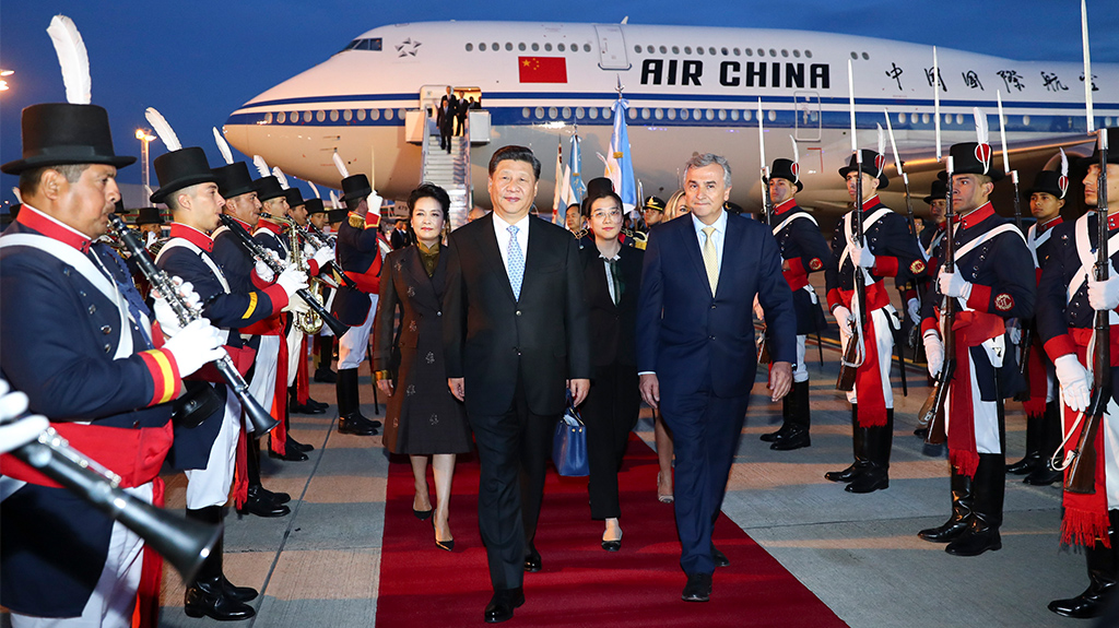 儀仗隊長趨前致敬,軍樂團奏響雄勁有力的進行曲,習近平和彭麗媛沿紅地毯前行,禮兵分列紅地毯兩側,行注目禮。習近平指出,阿根廷是首個舉辦二十國集團領導人峰會的南美國家,今年又恰逢峰會啟動10周年,具有重要意義。