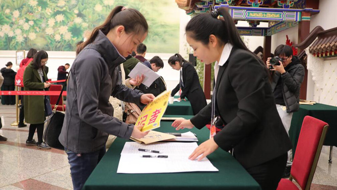 2018年3月1日,2018年全國(guó)兩會(huì)即將召開(kāi),在人民大會(huì)堂,記者排隊(duì)領(lǐng)取記者證。目前已有3000多名中外記者報(bào)名采訪全國(guó)兩會(huì),其中境內(nèi)記者2000人左右,港澳臺(tái)記者和外國(guó)記者1000多人。