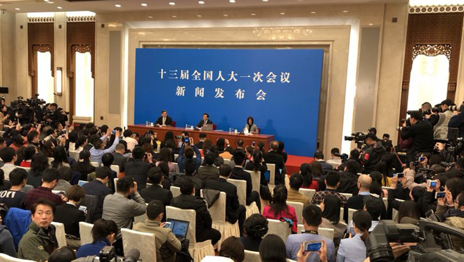 2018年3月4日, 十三屆全國(guó)人大一次會(huì)議在北京人民大會(huì)堂新聞發(fā)布廳舉行新聞發(fā)布會(huì),大會(huì)發(fā)言人張業(yè)遂就大會(huì)議程和人大工作相關(guān)的問(wèn)題回答中外記者的提問(wèn)。