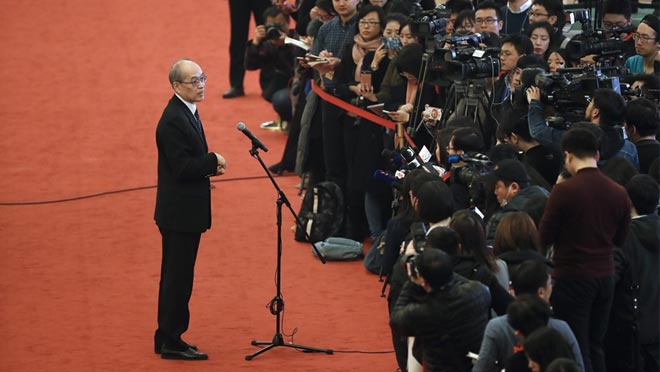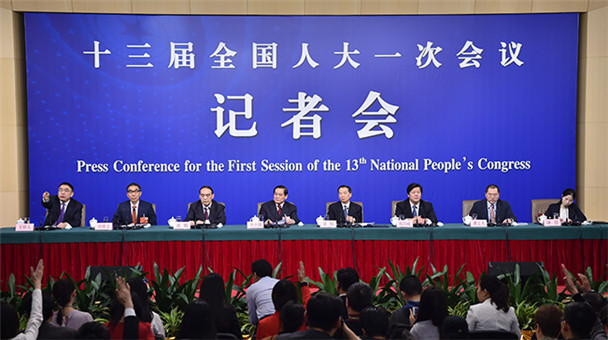 會(huì)議結(jié)束后,國(guó)家發(fā)展和改革委員會(huì)主任何立峰、國(guó)家衛(wèi)生和計(jì)劃生育委員會(huì)主任李斌、水利部部長(zhǎng)陳雷、國(guó)家工商行政管理總局局長(zhǎng)張茅、中國(guó)銀行業(yè)監(jiān)督管理委員會(huì)主席郭樹(shù)清、國(guó)務(wù)院港澳事務(wù)辦公室主任張曉明在“部長(zhǎng)通道”接受采訪。