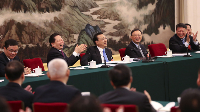 李克強(qiáng)總理3月12日來(lái)到十三屆全國(guó)人大一次會(huì)議湖南代表團(tuán)參加審議。代表們就改革創(chuàng)新、中國(guó)制造提質(zhì)增效、“互聯(lián)網(wǎng)+服務(wù)業(yè)”融合發(fā)展、有效降低企業(yè)杠桿率、精準(zhǔn)脫貧攻堅(jiān)、分享優(yōu)質(zhì)教育資源等提出十多條實(shí)實(shí)在在的建議。