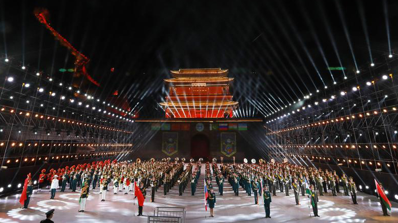 據新華社報道,4月24日,8支軍樂團在軍樂節開幕式上合奏上合組織軍樂節的主題曲《和平號角》。