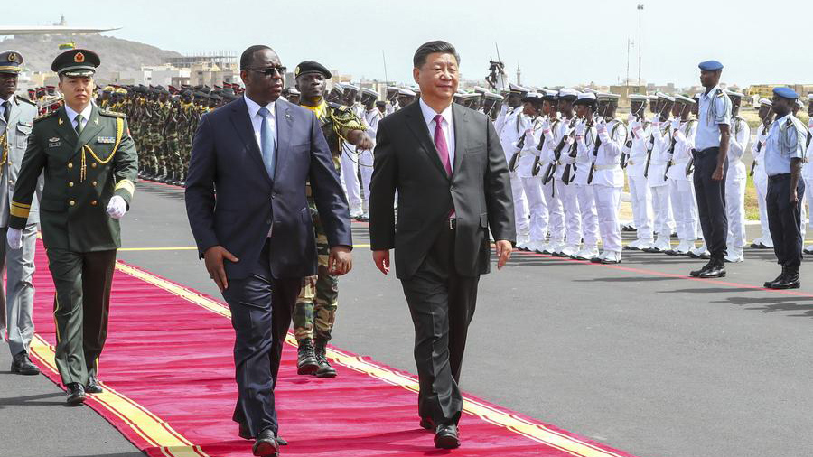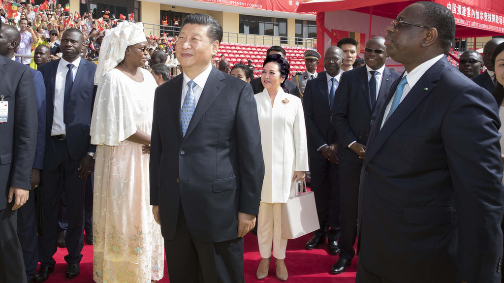 國家主席習近平22日在達喀爾同塞內加爾總統薩勒共同出席塞內加爾競技摔跤場項目移交儀式。