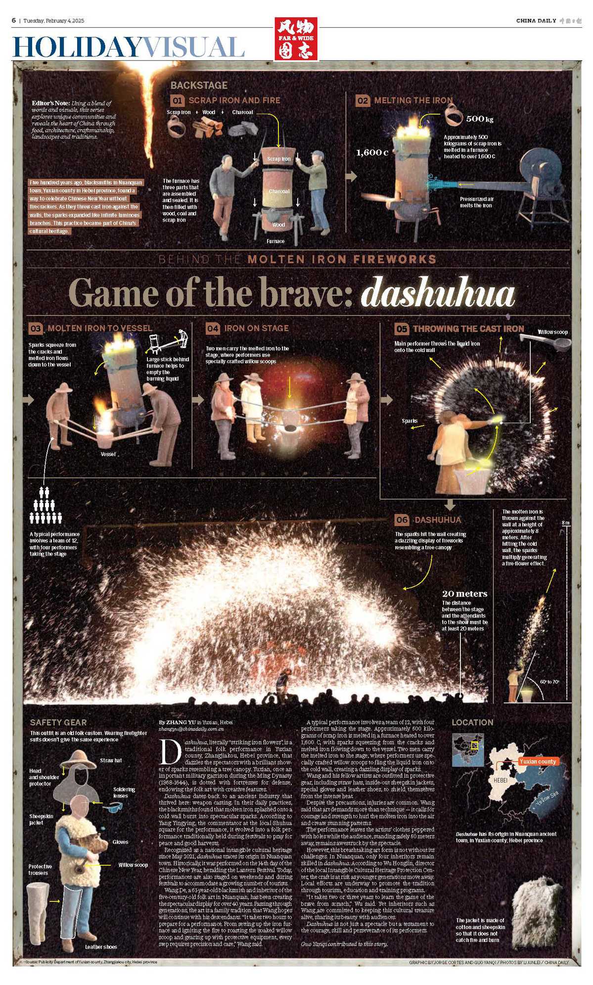 中國日報網2月4日電(記者 田馳 單娟 李欣磊 Jorge Cortes 張余 郭研奇)2025年2月4日,《中國日報》第6版刊發整版報道Game of the brave: dashuhua。該報道是中國日報風物圖志(Far&Wide)欄目第十一期,以信息可視化形式展現“風物”之美,介紹了中國歷史文化名鎮——河北張家口蔚縣暖泉古鎮獨特的民俗活動“打樹花”。精美的版面設計展示了“打樹花”制作工藝流程,呈現了“火樹金花不夜天”的壯麗景觀。