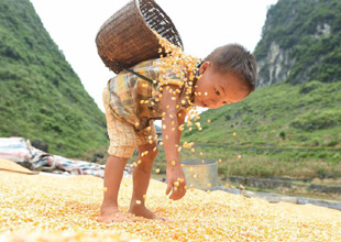 在廣西大化板升鄉(xiāng)弄勇村,7歲的藍桂景在幫忙家里晾曬玉米,他的家剛剛從山弄里搬到公路邊(8月7日攝)。新華社記者 黃孝邦 攝 在廣西大化七百弄鄉(xiāng)弄良村弄丘屯,讀初一的藍寶石在玉米地間騎著山地車玩耍(8月10日攝)。