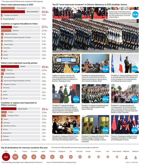 一項最新調查顯示,大部分受訪民眾認為,2015年中國國際地位有所提升,中俄關系“令人滿意”。