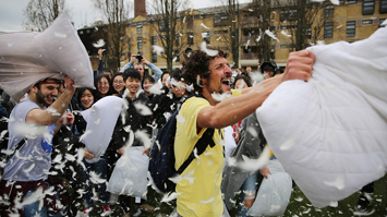 歐洲多國舉辦“枕頭大戰” 參加者“打群架”互扔枕頭”累癱“在地