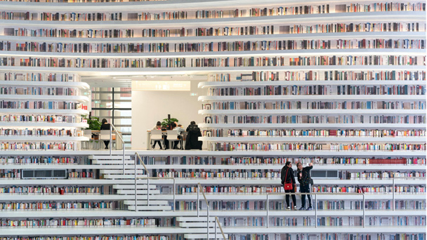天津濱海圖書館"書山"造型震撼亮相 被外媒譽為“全球最酷圖書館”