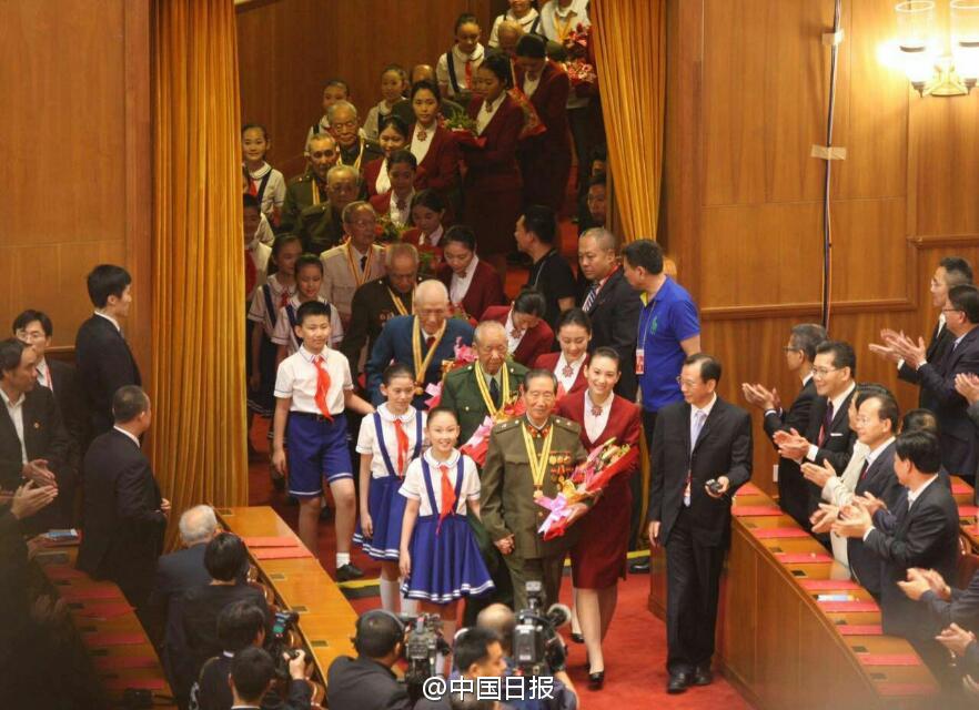 在紀(jì)念中國(guó)人民抗日戰(zhàn)爭(zhēng)暨世界反法西斯戰(zhàn)爭(zhēng)勝利70周年文藝晚會(huì)開(kāi)演之前,70名抗戰(zhàn)老戰(zhàn)士緩緩步入人民大會(huì)堂。