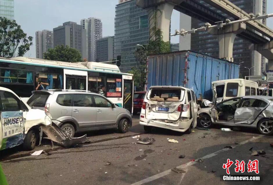 8月31日15時40分許,重慶北部新區金渝大道愛家西西里長下坡路段,一輛貨車與正在道路前方路口等待交通信號燈通行的車輛相撞,致17輛車不同程度受損,2名駕駛人員受輕傷的交通事故。