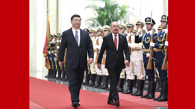 11月2日,國(guó)家主席習(xí)近平在北京人民大會(huì)堂同多米尼加總統(tǒng)梅迪納舉行會(huì)談。這是會(huì)談前,習(xí)近平在人民大會(huì)堂北大廳為梅迪納舉行歡迎儀式。新華社記者 燕雁 攝
