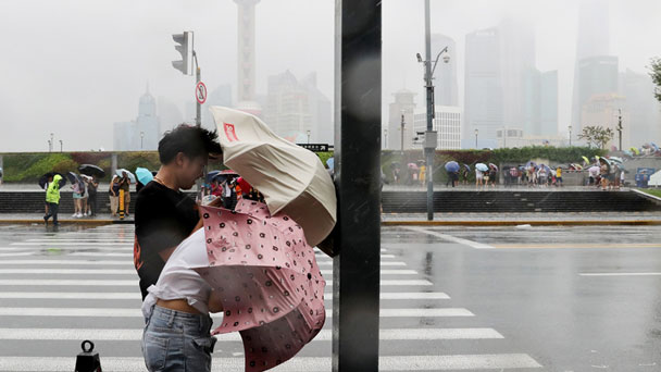 當日,今年第18號臺風“溫比亞”在上海浦東新區南部沿海登陸。新華社記者 方喆 攝 8月17日,在上海外灘,一名小朋友的雨傘在大風中被吹變形。