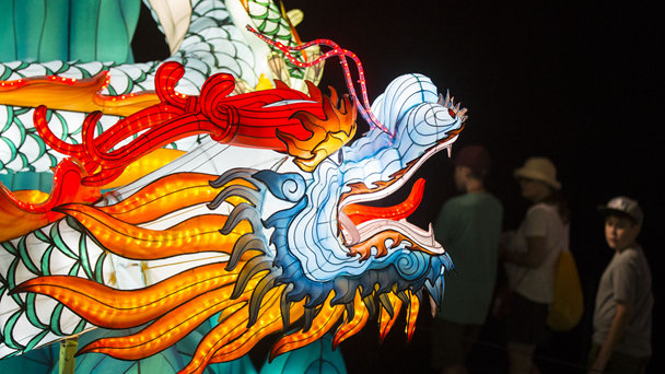 8月18日,在加拿大多倫多,觀眾在展覽會上參觀燈展。本屆展覽會推出以“絲綢之路”為主題的中國燈展,通過17組由中國四川自貢90位匠人制作的大型彩燈,向人們介紹古代“絲綢之路”的神話傳說和文化風情。
