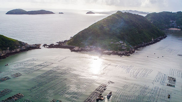 8月18日,南麂島馬祖岙海灣內,養殖戶乘船在大黃魚養殖區內作業,每一個深水網箱內養殖有一萬尾以上的大黃魚(無人機拍攝)。近年來,南麂鎮政府引導漁民養殖戶充分發揮“靠海吃?!钡馁Y源優勢,大力發展海洋養殖經濟和海島旅游經濟,實現了南麂由“生態美”向“產業美”,“產業美”向“經濟美”的轉變。