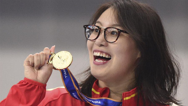 笑臉一種幸福……張張笑臉為緊張的天津全運會賽場帶來輕松、歡樂與溫馨……笑臉一種幸福……張張笑臉為緊張的天津全運會賽場帶來輕松、歡樂與溫馨…… 這是9月2日,奪得全運會游泳女子100米仰泳冠軍后,傅園慧展示金牌。