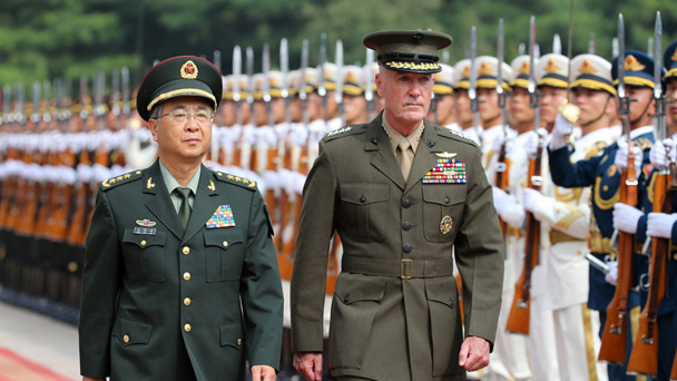 2017年8月15日下午,北京,中央軍委委員、軍委聯合參謀部參謀長房峰輝在八一大樓與美軍參聯會主席鄧福德舉行會談。會談前,房峰輝為鄧福德舉行歡迎儀式,并陪同檢閱了中國人民解放軍三軍儀仗隊。