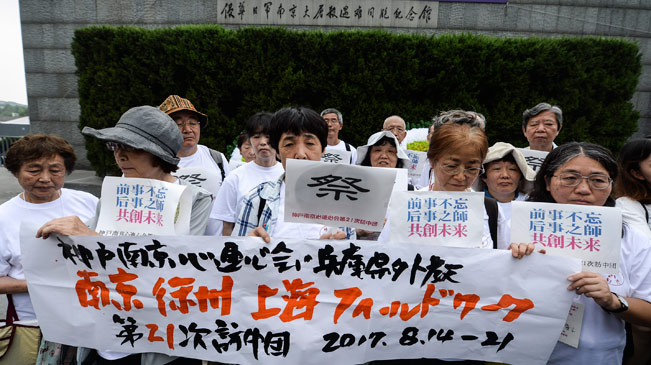 8月15日,日本“神戶·南京心連心會”第21次訪華團成員在和平集會上。當日,“2017年南京國際和平集會”在侵華日軍南京大屠殺遇難同胞紀念館舉行。