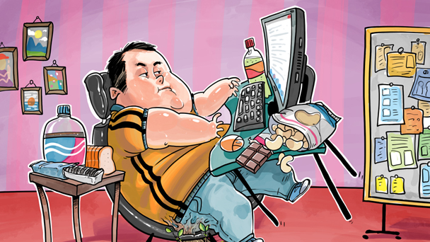 不健康的飲食習(xí)慣、久坐的生活方式導(dǎo)致職場白領(lǐng)出現(xiàn)“過勞肥”的現(xiàn)象。