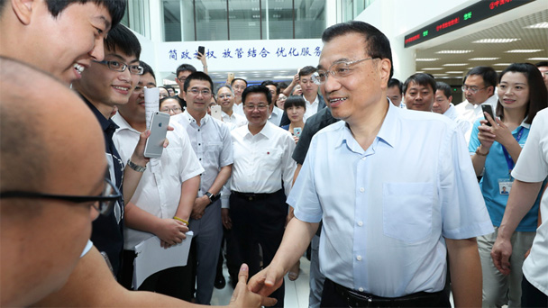 在出席夏季達(dá)沃斯論壇期間,中共中央政治局常委、國務(wù)院總理李克強(qiáng)在遼寧大連考察。這是6月26日,李克強(qiáng)在遼寧自貿(mào)試驗區(qū)大連片區(qū)綜合服務(wù)大廳與在現(xiàn)場辦事的企業(yè)人員交流。新華社記者 龐興雷 攝