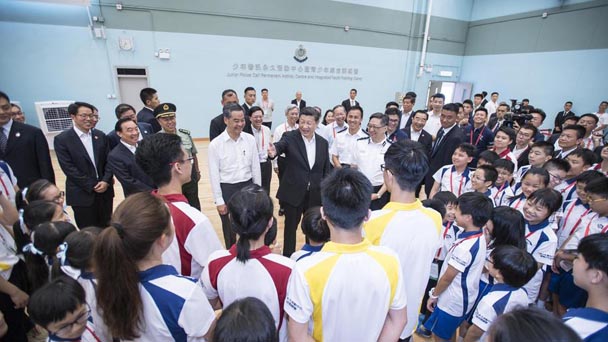 6月30日上午,國家主席習(xí)近平來到香港少年警訊永久活動中心暨青少年綜合訓(xùn)練營考察,看望正在訓(xùn)練的香港青少年。新華社記者 李濤 攝 6月30日上午,國家主席習(xí)近平來到香港少年警訊永久活動中心暨青少年綜合訓(xùn)練營考察,看望正在訓(xùn)練的香港青少年。
