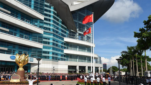 7月1日,香港特別行政區(qū)政府在金紫荊廣場舉行升旗儀式,慶祝香港回歸祖國20周年。新華社記者 吳曉凌