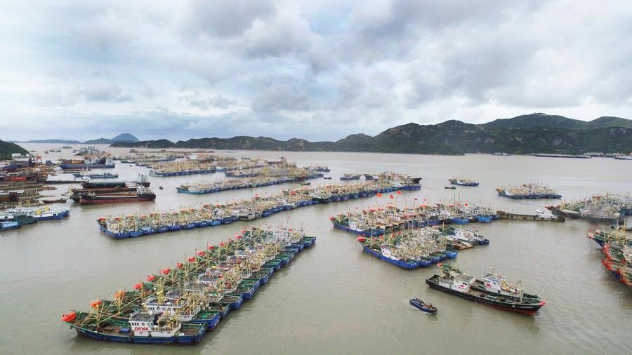 8月12日,漁船返回浙江省溫州市蒼南縣一漁港躲避臺(tái)風(fēng)(無人機(jī)拍攝)。 新華社發(fā)(蘇巧將 攝) 8月12日,在浙江省溫州市蒼南縣一漁港,歸港漁民在卸載海產(chǎn)品。 新華社發(fā)(劉振清 攝) 8月12日,漁船在浙江省溫嶺市一漁港躲避臺(tái)風(fēng)。