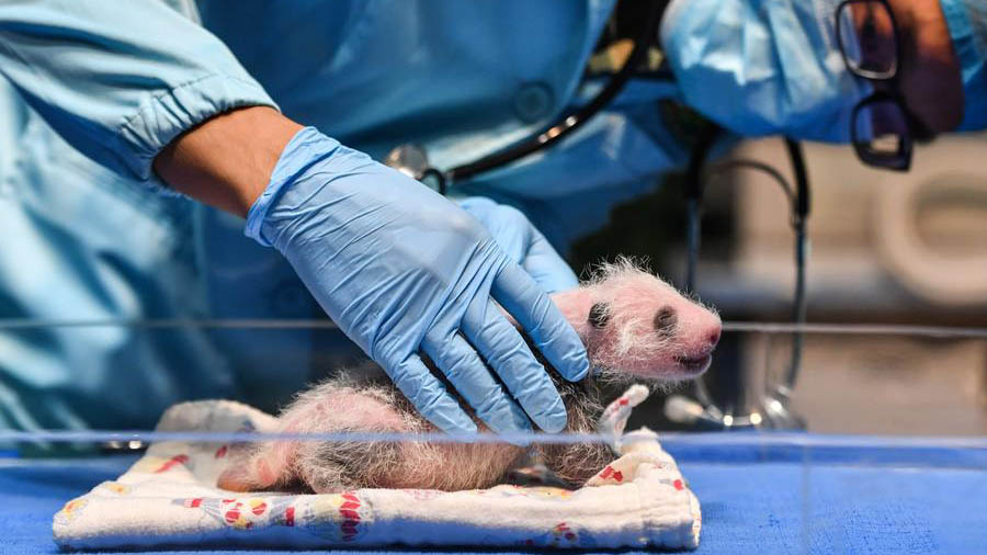 8月12日,中國大熊貓保護(hù)研究中心專家在華南大熊貓繁育基地公布新生大熊貓“隆仔”(左)和“婷仔”的部分體檢數(shù)據(jù)。 新華社記者 劉大偉 攝 8月12日,在廣州長隆野生動(dòng)物世界華南大熊貓繁育基地,新生大熊貓“婷仔”接受體檢稱重。