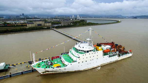 8月12日,順利返航的“向陽紅10”科考船停靠在舟山長峙島科考碼頭。 新華社發(fā)(姚峰 攝) 8月12日,參加2018年杭州青少年海洋科學(xué)考察活動(dòng)的學(xué)員們登上“向陽紅10”科考船參觀。