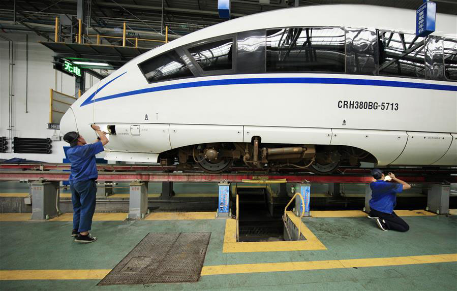 暑運(yùn)期間,中國鐵路沈陽局集團(tuán)有限公司沈陽動(dòng)車段組織青年機(jī)械師開展崗位練兵活動(dòng),確保列車安全運(yùn)行。新華社發(fā)(宮文波 攝) 8月13日,沈陽動(dòng)車段青年職工在動(dòng)車檢修庫檢修動(dòng)車組。