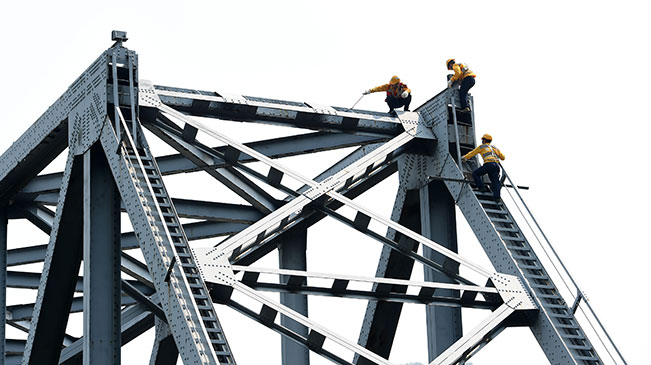 位于重慶市北碚區(qū)的嘉陵江鐵路鋼梁大橋建于1970年。新華社記者 唐奕 攝 8月14日,“護(hù)橋衛(wèi)士”在工長周子義(中)的指導(dǎo)下對鋼梁大橋溫調(diào)器進(jìn)行檢查和養(yǎng)護(hù)作業(yè)。新華社記者 唐奕 攝 8月14日,“護(hù)橋衛(wèi)士”在嘉陵江鐵路鋼梁大橋頂部對鋼桁梁進(jìn)行檢查。