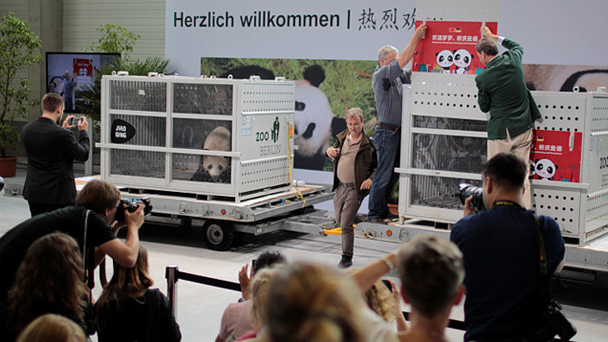當地時間6月24日,來自中國的大熊貓“夢夢”和“嬌慶”抵達德國首都柏林。在那里,它們將生活15年,參與中德科學家的大熊貓科研保護國際合作。