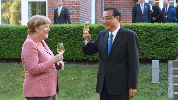 當地時間31日晚,中德總理年度會晤后,李克強接受默克爾盛情邀請,前往柏林郊外別墅,出席默克爾特意為他舉行的小范圍晚宴。夕陽余暉中,兩國總理舉著香檳開懷暢談。據悉,在會晤中一些意猶未盡的話題又被帶到了晚宴上。