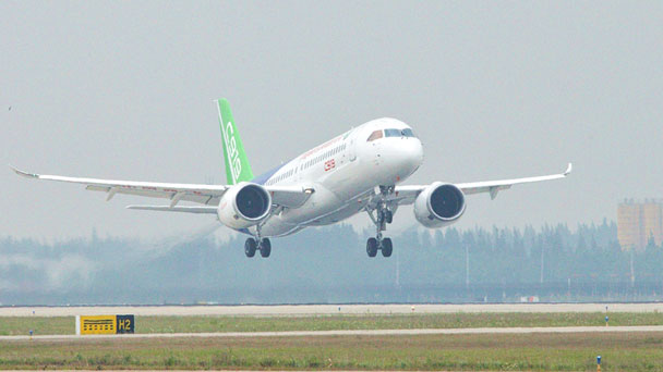 5月5日,中國首款國際主流水準的干線客機C919在上海浦東國際機場首飛。新華社記者 丁汀 攝 5月5日,中國首款國際主流水準的干線客機C919在上海浦東國際機場首飛。