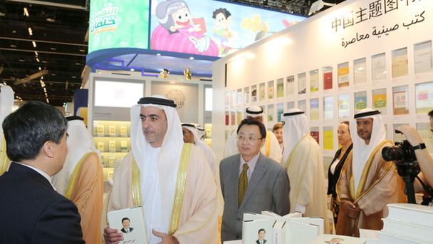 4月26日,在阿聯(lián)酋阿布扎比,阿聯(lián)酋副總理兼內(nèi)政部長(zhǎng)賽義夫·本·扎耶德·阿勒納哈揚(yáng)(前左二)參觀展出的《習(xí)近平談治國(guó)理政》阿文版。為進(jìn)一步增強(qiáng)絲路精神的廣泛認(rèn)同,深化中阿合作,促進(jìn)文明互鑒,《習(xí)近平談治國(guó)理政》阿文版研討推介會(huì)26日在第27屆阿布扎比國(guó)際書展中國(guó)主賓國(guó)活動(dòng)上舉行。