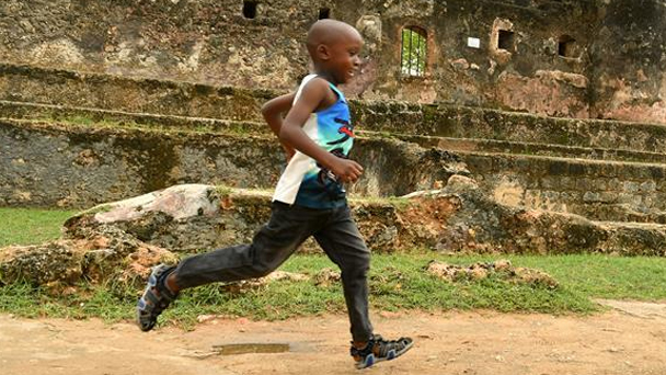 4月29日,在肯尼亞蒙巴薩的耶穌堡,兩名孩子走過一些舊火炮。