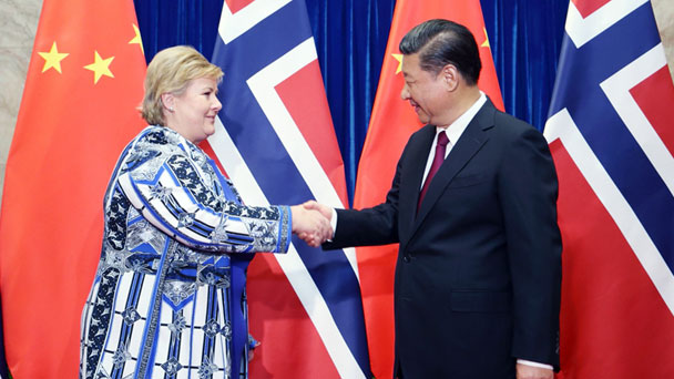 4月10日,國家主席習近平在北京人民大會堂會見挪威首相索爾貝格。新華社記者姚大偉攝