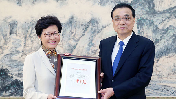 國務院總理李克強4月11日上午在中南海紫光閣會見林鄭月娥,頒發了任命她為中華人民共和國香港特別行政區第五任行政長官的國務院第678號令。