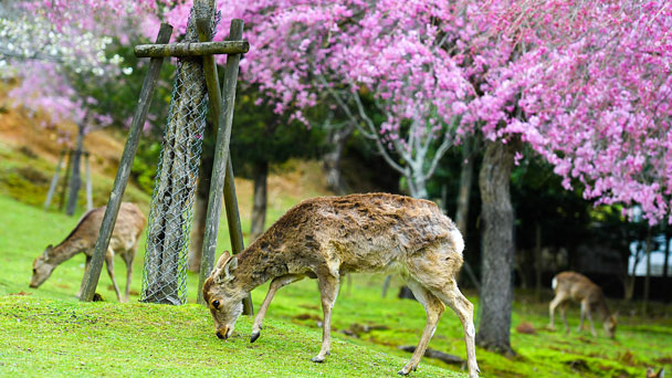 近日日本奈良市的奈良公園內,千株櫻花盛開粉白勝雪,小鹿如林間精靈一般穿行其中。奈良公園囊括了由天平時代延續下來的東大寺、興福寺以及正倉院等名勝古跡,是一座規模雄偉、綠樹成蔭的歷史公園。