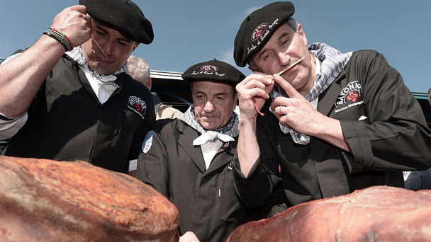 當地時間4月13日,法國第555屆巴約納火腿集市開幕,各家火腿生產商都拿出“看家火腿”來這里一決高下。