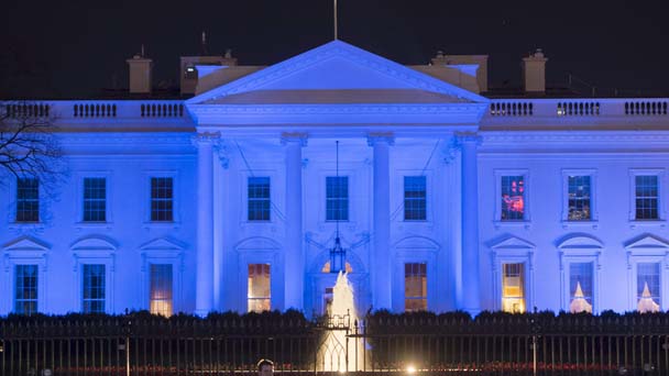 當地時間4月2日,位于華盛頓的美國白宮點亮藍色燈光,紀念世界自閉癥日。