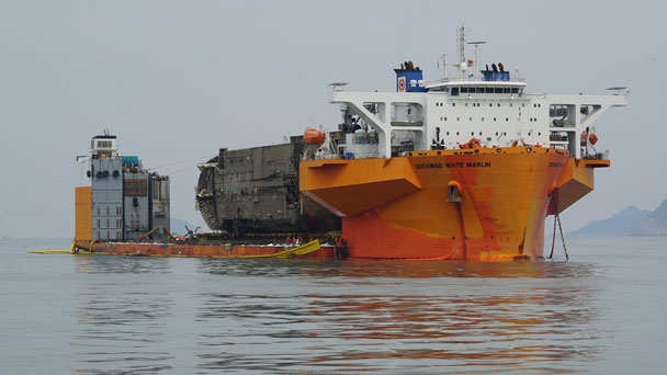 25日下午,銹跡斑斑的船體整體出水,打撈作業最關鍵也是最困難的“整體起浮”階段取得成功。這意味著“世越”號打撈工作基本宣告成功。韓國海洋水產部26日消息稱,為將“世越”號沉船運至木浦新港,打撈組正加速進行排水和除油工作。