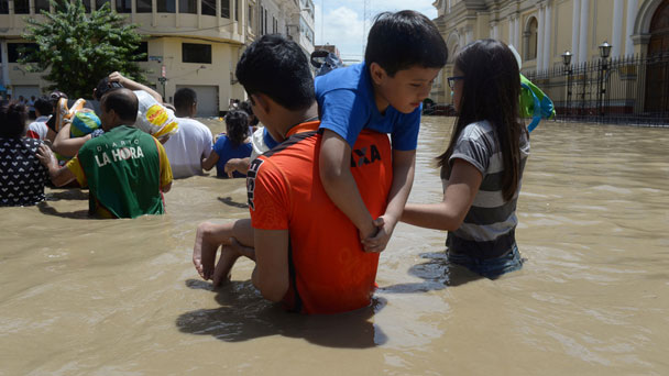 秘魯多地連續多日持續遭到洪水襲擊。由于連續15個小時的暴雨,秘魯北部的皮烏拉出現河水決堤、街道被淹,當地民眾不得不穿過積水的街道。