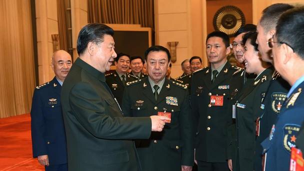 3月12日,中共中央總書記、國家主席、中央軍委主席習近平出席十二屆全國人大五次會議解放軍代表團全體會議并發(fā)表重要講話。